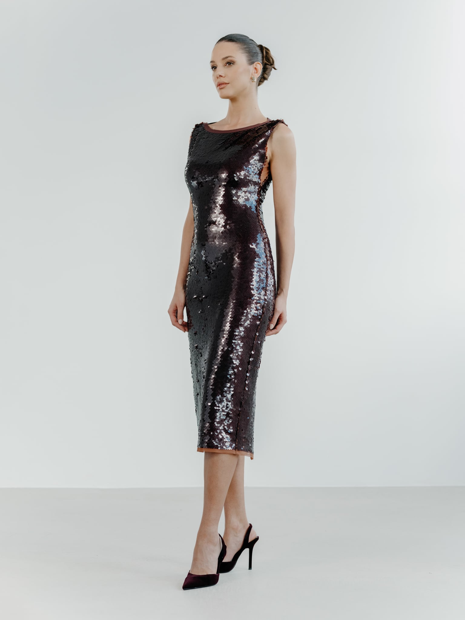 Crafted from Atelier Rioux â Paris sequins, with a deep sheen and subtle reflections, this dress defines elegance through simplicity and precision. The textured surface creates a refined play of light, while maintaining the sobriety of a classic piece. The cut follows the natural line of the body, shaping the silhouette in a balanced and clean way. The neckline, set at the base of the neck, brings a touch of classic refinement and highlights the shoulders without revealing. The construction is designed to maintain an impeccable shape, while the back zipper closure is discreetly integrated. The back slit ensures ease of movement, preserving the fluid line of the dress.