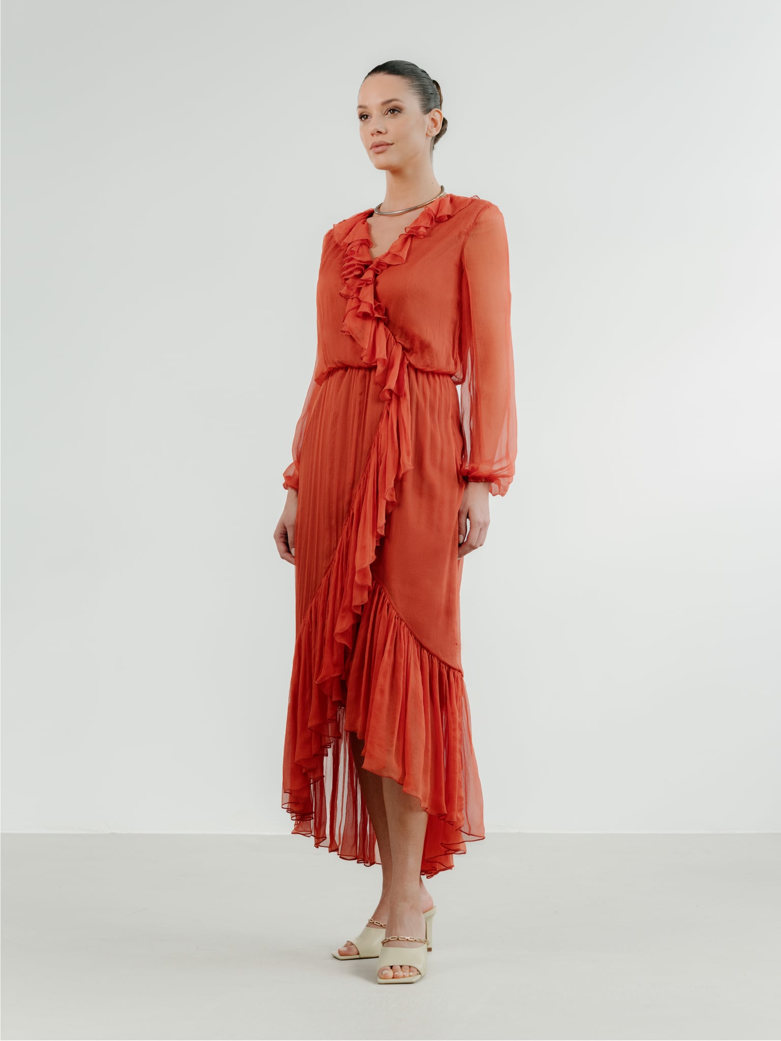 DISPONIBILĂ PENTRU PRECOMANDĂ - 10 zile lucrătoare Realizată integral din mătase naturală, cu o textură ușor translucidă și o fluiditate delicată, această rochie se remarcă printr-o eleganță expresivă și o mișcare continuă a materialului. Nuanța caldă de coral intens aduce lumină pielii, în timp ce volanele aplicate creează un ritm vizual sofisticat și feminin. Decolteul în V, accentuat de detaliile cu volane, alungește linia gâtului, iar talia marcată prin elastic conturează subtil silueta fără a restricționa libertatea de mișcare. Fusta asimetrică, construită în straturi fluide, oferă dinamism și o cădere naturală, urmărind fiecare pas cu lejeritate. O piesă cu personalitate, potrivită pentru evenimente de zi, seri de vară sau momente în care feminitatea se exprimă liber, prin culoare și mișcare.